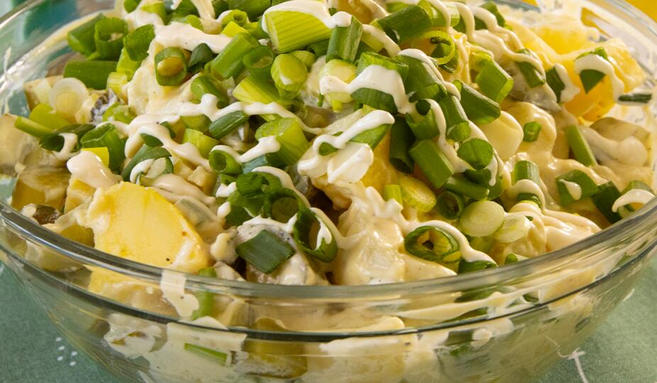 Картофите се варят в подсолена вода. Лукът се нарязва на колелца, а киселите краставички и картофите – на кубчета. В касерола се затопля готварски крем CREMIO, добавя се сол, черен пипер и 2/3 от пресния лук заедно с горчицата. Сместа се бърка, докато стане хомогенна и лукът омекне, но не трябва да завира. Картофите се овкусяват и смесват с киселите краставички, заливат се с топлата смес и се разбъркват. Салата се аранжира с останалия пресен лук отгоре.