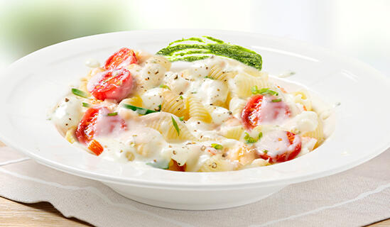 200 мл готварски крем Cremio 1 пакет паста конкилие 2 ч.л. песто 250 г чери домати 50 г настърган пармезан