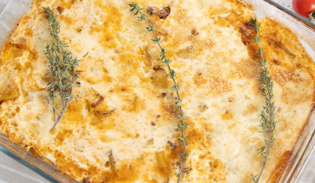 500 г кайма 1 кг картофи 200 мл готварски крем CREMIO 50 г доматено пюре 2 бр. глави лук 1 бр. морков 2 бр. яйца