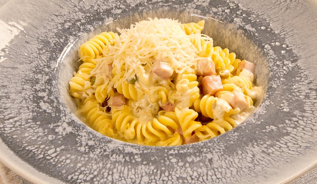 Пастата се сварява в подсолена вода за 10-12 мин. Лукът се нарязва на ситно, а шунката – на кубчета. Пармезанът се настъргва. Пастата се отцежда и се оставя да се охлади, като може да се разбърка с малко олио, за да не слепне. Лукът се задушава до златисто в нагорещен тиган със зехтин и олио. Добавя се шунка и грах, разбърква се за 1 мин. и се залива с готварски крем CREMIO. Овкусява се със сол и черен пипер. Пастата се добавя в соса и се разбърква за 2 мин. Поръсва се с пармезан и се сервира.