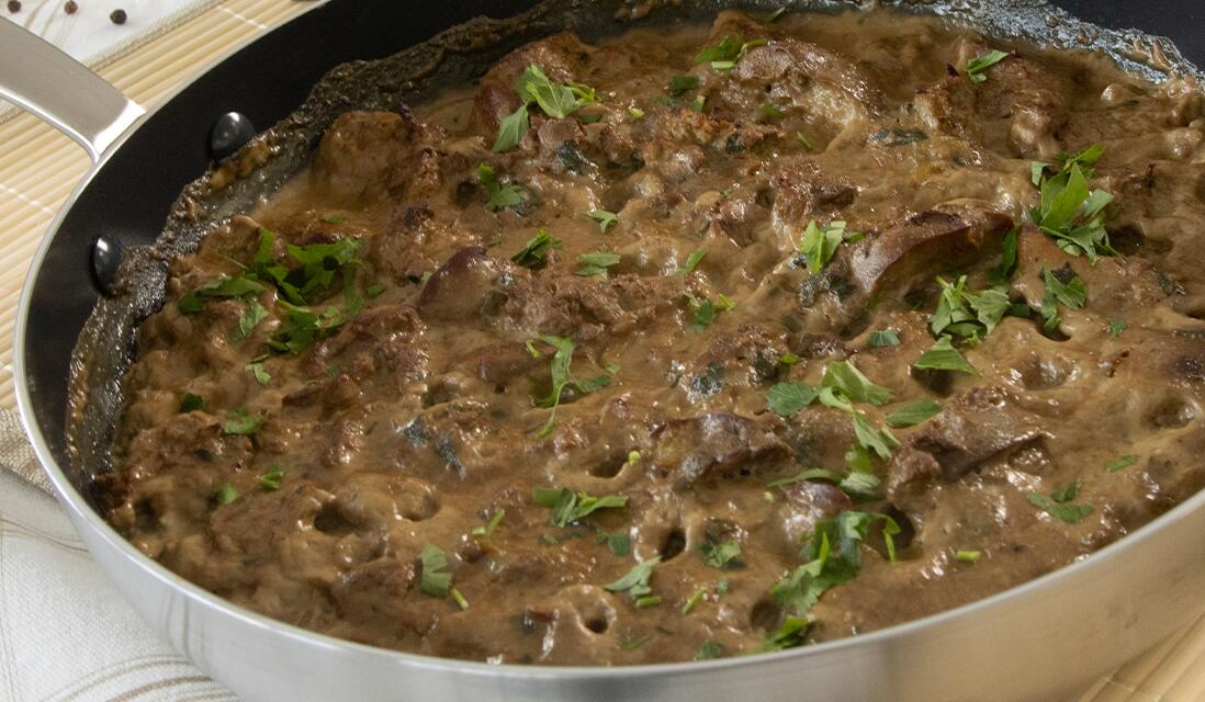 Пресният лук се нарязва на кръгчета и се задушава в горещ тиган за 2-3 мин. Прибавят се дробчетата, разбъркват се и се готвят 6-7 мин., докато си сменят цвета и им се изпари водата. Магданозът се нарязва на ситно. Към дробчетата се добавят част от магданоза, бирата и постепенно се изсипва готварски крем CREMIO. Овкусява се със сол и черен пипер. Пече се на 200°C за 20 мин. При сервиране се поръсва с магданоз.