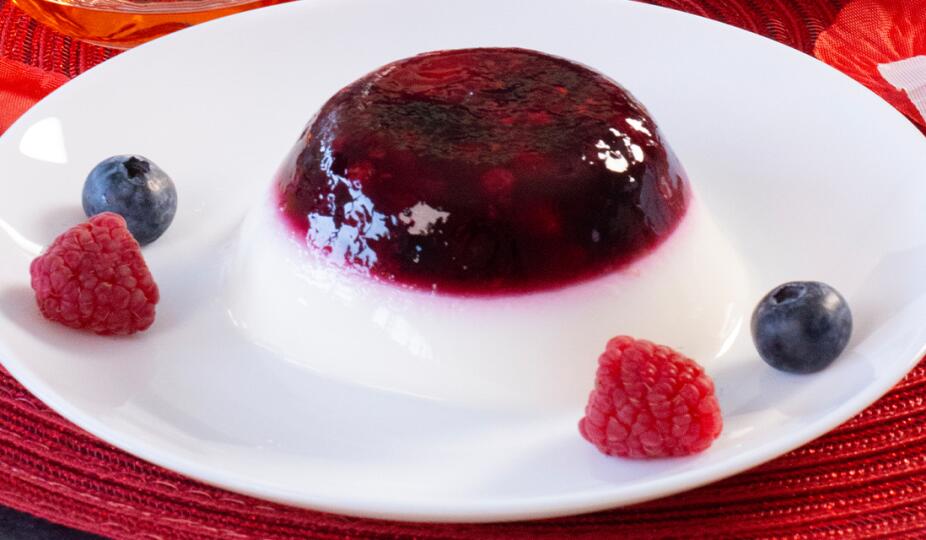 Прясното мляко със захарта и сладкарският крем CREMIO се загряват в касерола на слаб огън при непрекъснато бъркане, без да завира. Накрая се прибавя ликьорът и есенцията от ванилия. Готовата смес се отстранява от котлона, добавят се останалите листчета желатин, разбърква се и се оставя да се охлади. Сместа се изсипва върху плодовата основа в купичките и се връщат в хладилника за още 12 часа. Охладените кремчета се изсипват върху десертни чинийки с леко потупване. Можете да аранжирате се със свежи горски плодове.