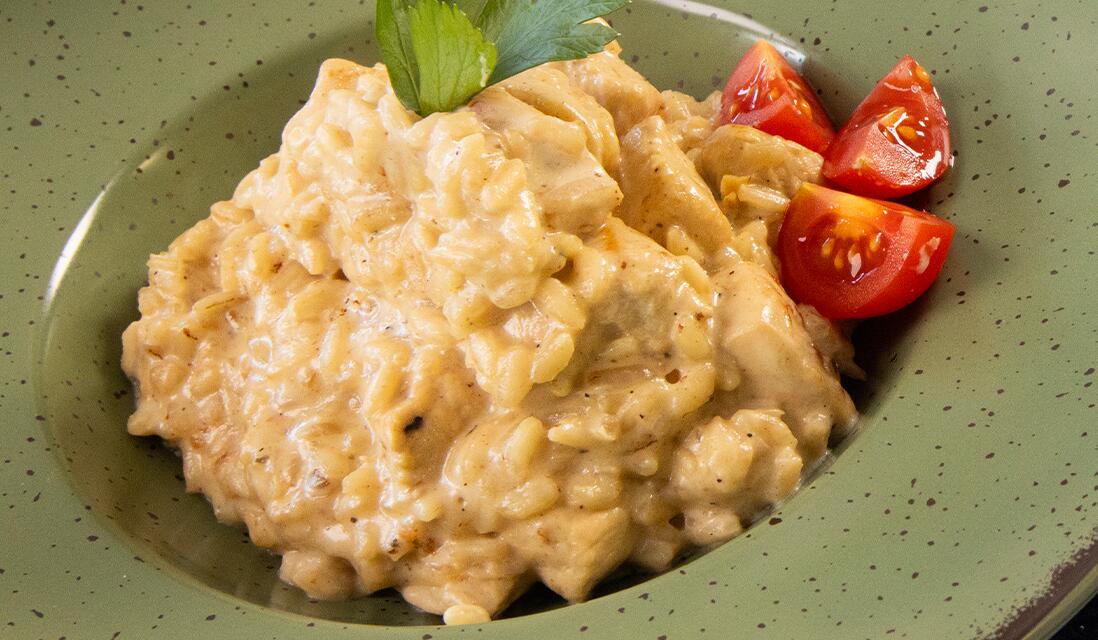 Лукът се нарязва на ситно, а пилешкото филе – на кубчета. Бульонът се разтваря в 1.5 л топла вода. Лукът се запържва в загрят тиган с олио за 2 мин. Добавя се пилешкото месо и се запича до златисто за 4 мин., като се бърка. Прибавя се оризът и малко олио. Залива се с виното, разбърква се за 30 сек. и се налива разтвореният бульон. Оставя се да къкри в тигана за около 20-25 мин., без да се бърка. Когато оризът поеме соса, се овкусява със сол и черен пипер. Добавя се готварският крем CREMIO и се разбърква. Накрая се прибавя пармезанът, разбърква се и се сервира с украса от магданоз.